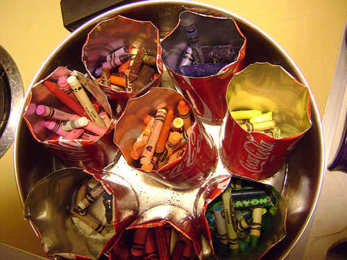 Aluminio latas llena de crayones en una cacerola vieja que tiene aproximadamente una pulgada de agua en el mismo lugar. Si las latas no tiene mucho de ellos, flotarán. Esto es un poco de dolor pero todavía funden las ceras dentro de voluntad.