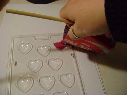 Pone un poco de papel y poner el molde sobre el papel. Pellizcar un pico en la parte superior de la lata, utilizar la varilla de pasador o stir stick para retener cualquier grupos de unmelted lápices de colores. Vierta cuidadosamente en los moldes de caramelo. Las latas no son calientes, pero la cera se.