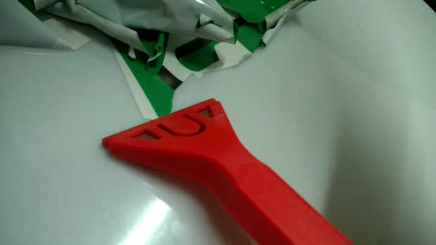 Empezando en el borde de la muestra y suavemente Retire el vinilo utilizando la rasqueta. Una vez que tenga una aleta del plástico, tirando firmemente hacia arriba en platic con una mano, lentamente se raspe en todas las direcciones. Intentar arrancar sin aplicar demasiada presión para no romper el plástico. Hacer todo lo posible para mantener el vinilo en una sola pieza. Si se rompe una pieza deberás separar el vinilo del forro plástico. Todos sabemos cuán difícil puede ser de nuestra experiencia con cinta de embalaje. Esto es en gran medida la parte más difícil del proceso.
