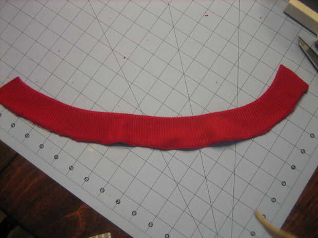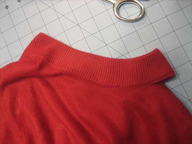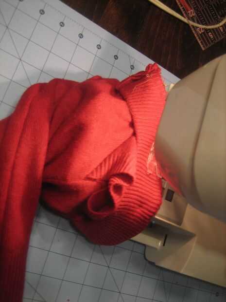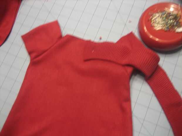 Para el escote, usé el escote del Jersey original. Yo cortarlo el suéter, así que tuve una tira. Cuando sujeta al vestido, no tengo suficiente, así que tuve que estirarlo como cosí para que funcione. Con vestido de escote de pin derecho-lado-hacia fuera, al revés del vestido. Coser los dos extremos crudos juntos. Coser al vestido.