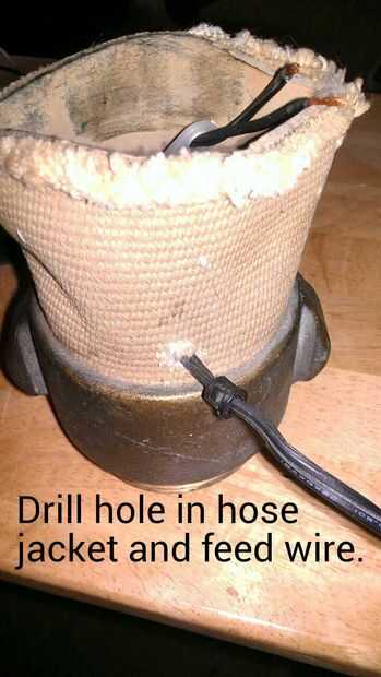 Comencé por taladrar un agujero en la chaqueta de la manguera. El latón es bastante pesado para ser una base constante. Pasar el alambre en el interior de la manguera y haga un nudo o usar la parada de alambre, para evitar sacar el cable.