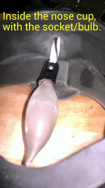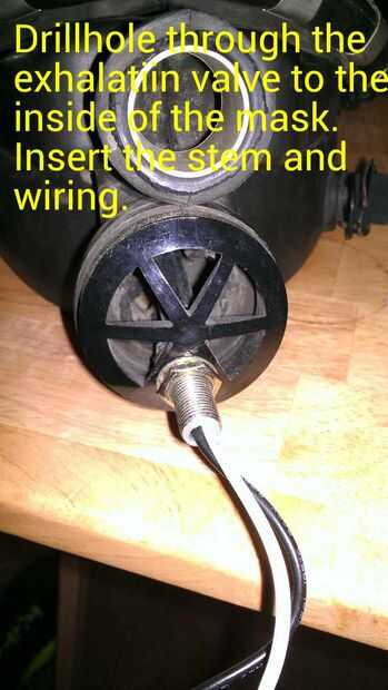 A continuación, perforé un agujero a través de la válvula de exhalación, en la mentonera, dentro de la máscara. Una vez que fue hecho, coloca el tallo de alambre a través de y alimentados con los cables. Dentro de la máscara, fue utilizado un soporte para colocar el portafoco mejor.