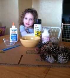 Si un niño mayor o adulto va a hacer este proyecto, se puede usar adhesivo en aerosol para los conos de pino. Sugeriría hacer afuera aunque como adhesivo en aerosol puede flotar en el aire y pegarse a las cosas no quieren pegajoso. Además de mejor ventilación.