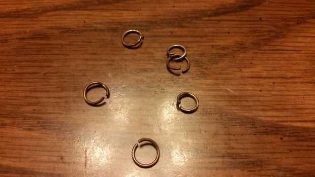 • anillos del salto. He utilizado las anillas del collar con las cadenas de oro/negro, porque quería utilizar sólo piezas de joyería que ya tenía. Así se ven un poco desgastadas. Necesitaba dos anillas por cadena y dos adicionales para los dos anillos grandes en el centro.