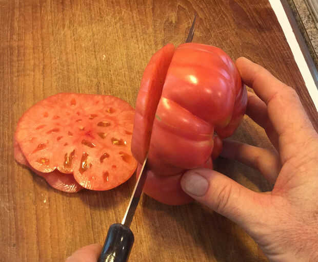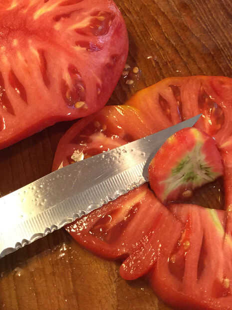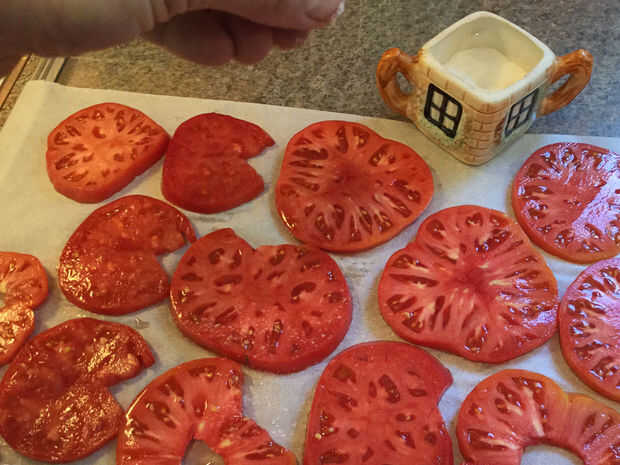 Durante la preparación de tomates para secar, cortar una rebanada fina de la parte inferior para exponer la carne interior, entonces hace aprox. 1/4" rodajas hasta que llego al extremo del tallo, que yo te tire en el cubo de compost. I cortar cualquier bits funky, organizar las piezas en hojas de pergamino de papel de hornear (yo lo he probado también el papel del arte pero las rodajas de tomate secos son más difíciles de quitar de él), luego le dan a cada rebanada una pizca pequeña de sal kosher.