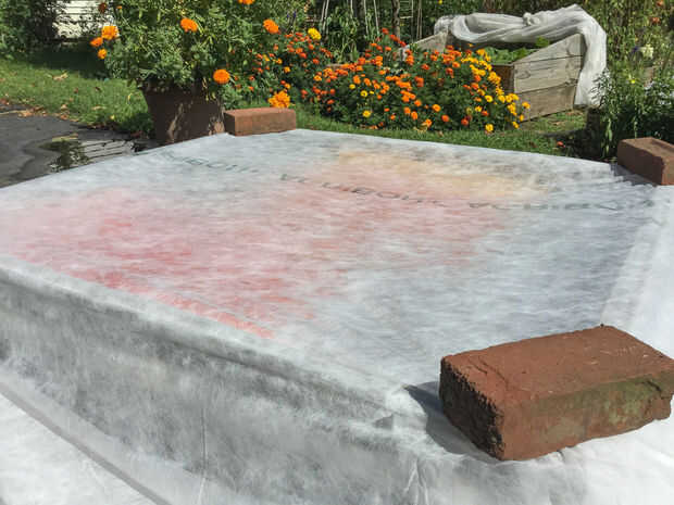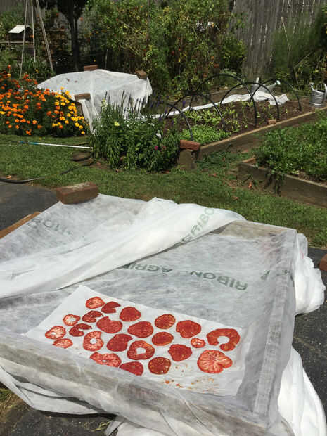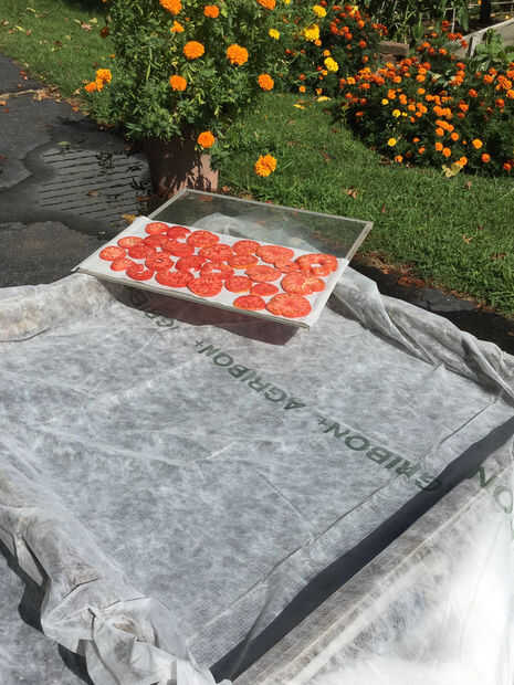 Entonces organizar las hojas de rodajas en la bandeja de la tapa. Está sentado en la parte inferior del interior de la tapa, por lo que es de 3.5" de espacio entre ellos y la parte superior de la estructura de la tapa. Cuando la cubierta de la fila se dobla sobre el bastidor, tensado y esquinas ponderadas (yo uso ladrillos), la tela no toca el producto secado pero actúa como una prueba de error, cubierta permeable al aire.