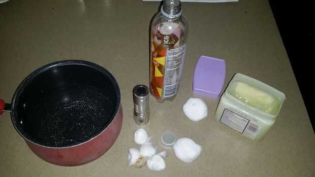 Cacerola con agua, enjuagar la botella de la bebida (plástico), bolas de algodón, vaselina y una vieja caja de linterna (debe tener anillos para ayudar a mantener el agua hacia fuera).