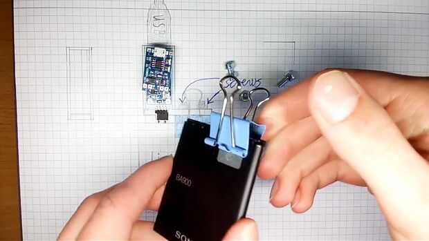 Mi dispositivo tiene que ser sostenido por la abrazadera de papel, por lo que será estar atornillada a la caja. Los dos PCB se sentará encima de la otra con el interior y salida en la parte superior y los pines de la batería en la parte inferior.