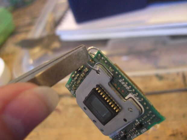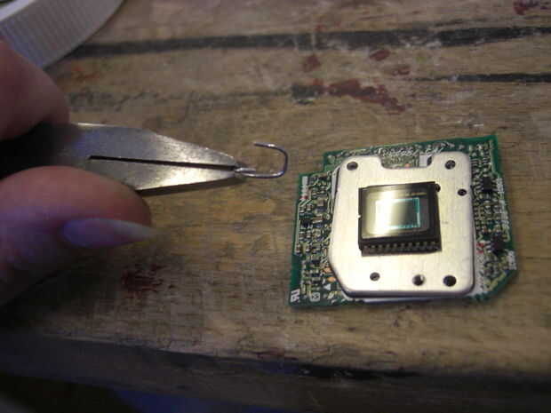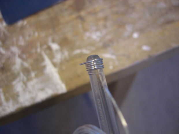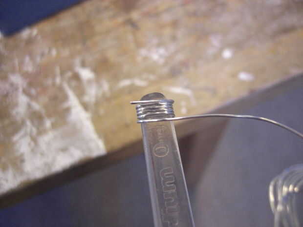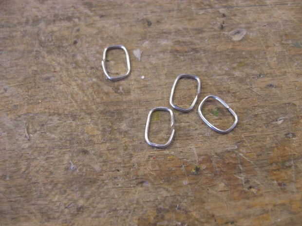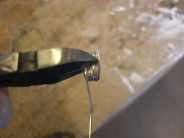 Sentado con mi circuito de la primera decisión que tenía que hacer, que conjunto de agujeros, que ya tenía, utilizaría para insertar los anillos de salto. Un sistema de agujeros donde un poco a un lado y sería hacer el circuito de inclinación cuando colgando, por eso elijo el otro conjunto. Entonces encontré algunos anillos del salto, desafortunadamente eran demasiado pequeños y anillos redondos más grandes se vería malos, así que decidí hacer anillos cuadrados. Para hacerlos, tuve que encontrar una barra cuadrada para enrollar el cable alrededor. Lo que encontré fue el final de cepillo de dientes viejo. Después de que el cable había sido enrollado, corté los anillos para hacerlos separado. Como había usado una wirecutter, tuve que lijar los extremos de las anillas cuadradas así que llegaron a ser planas. Esto era para asegurarse de que no raye me u otros a usar. Luego formé los anillos de salto un poco más con más con mis pinzas para asegurarse que estaba bien cuadrados y cerraría sin un boquete.
