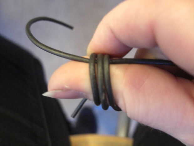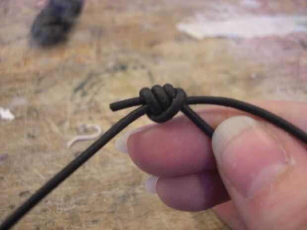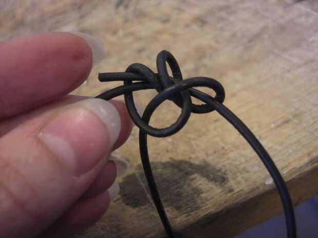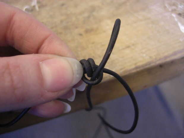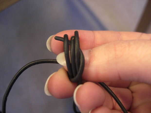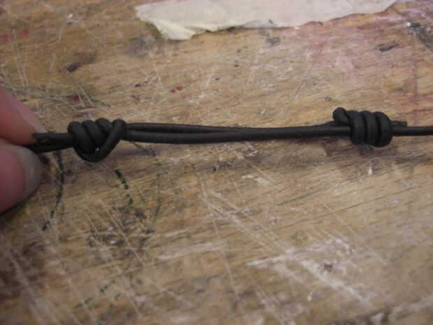 En primer lugar dividí el cordón de cuero en dos. Luego coloca una cuerda a lo largo de mi golpe y luego envuelve el otro alrededor de mi golpe y cuerda 3 veces. Entonces tomó el extremo de la cuerda envuelta y trajo sobre la bobina y había pegado debajo de la bobina en sentido contrario, misma dirección que mi golpe. Me quitan mi golpe de la bobina, evitando tirar el extremo del cable uno y dos. Luego poco a poco saqué en cada extremo de la cuerda en espiral para apretar el nudo, facilitando cada bobina abajo al lado de la anterior por lo que parece ordenado. Después de hecho que el primer nudo era buena y estrecha y no ceder, repetí con el otro cable alrededor. Luego he probado si se resbala effortly a lo largo de unos a otros, hubo un poco de fricción, pero no era demasiado malo.