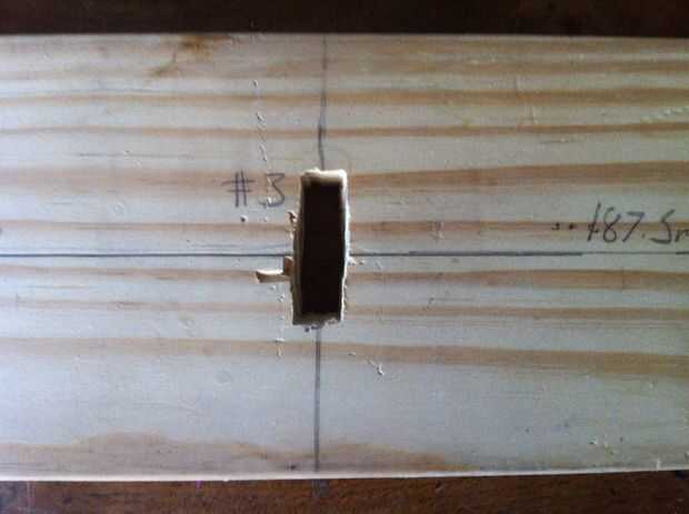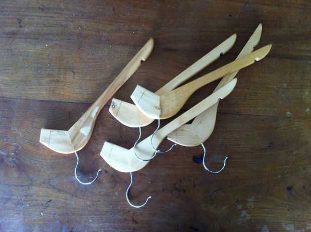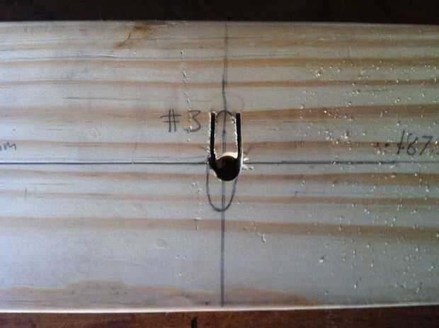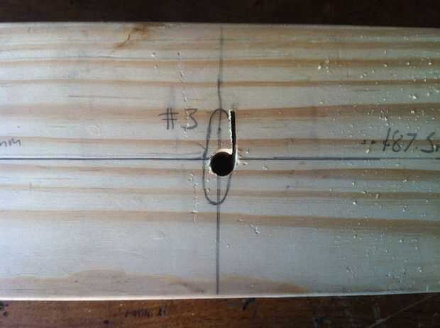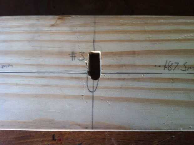 usando una sierra de mano cortar el otro brazo de la percha, prestando atención a las marcas y medidas. En la madera contrachapada practique primero un orificio como cerca del borde como sea posible, a continuación, utilizando una sierra de calar hacer dos cortes hacia la parte superior de las marcas de la percha. entonces usando numerosos cortes diagonales claro hacia fuera de la zona de los cortes verticales. repetir este proceso en el otro lado para despejar el área completa de la percha. Hacer esto para las otras marcas de cuatro perchas.