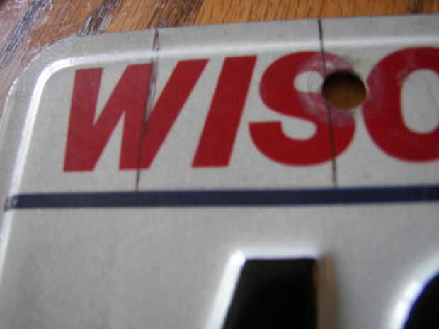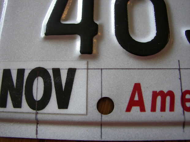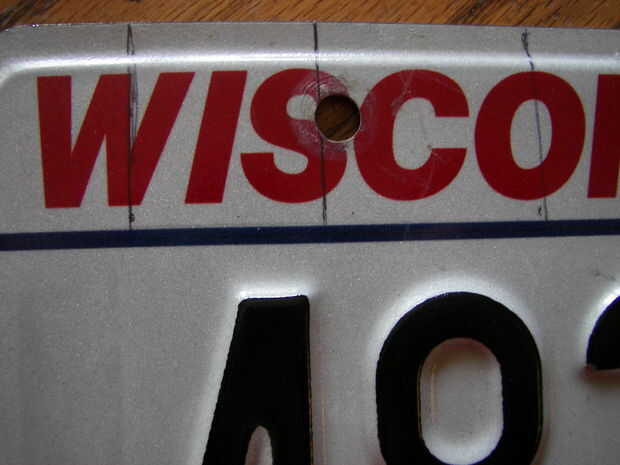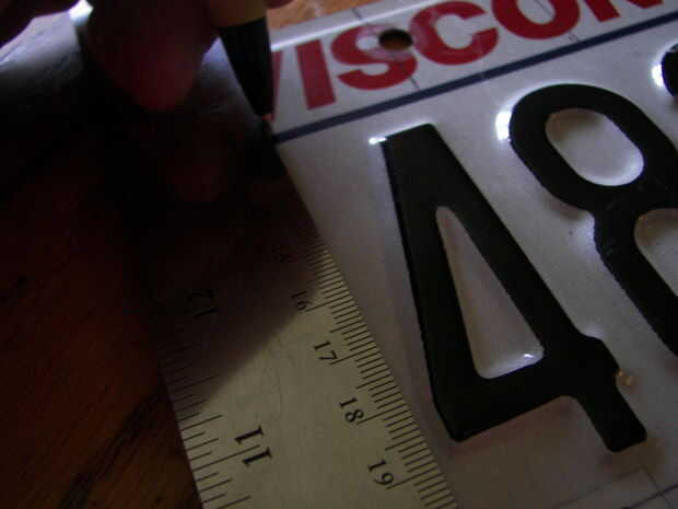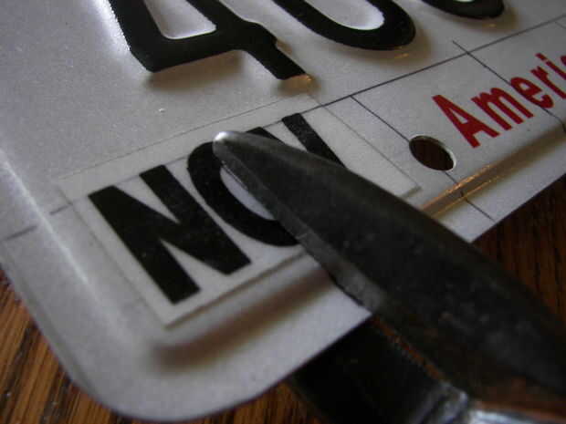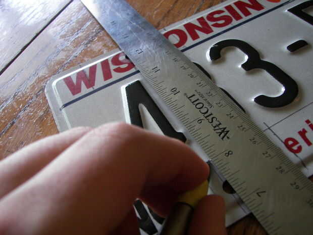 En primer lugar, dibuja dos líneas horizontales. Una de las líneas conviene 1 1/4 de pulgada de la parte superior de la placa de la licencia, y el otro debe establecerse la misma distancia desde la parte inferior. A continuación, se debe alinear verticalmente la regla con el borde de cada letra (y símbolo). Ahora, trace una línea (a lo largo del borde de la regla), como se muestra en una de las fotos de arriba. Debe haber ningunas líneas entre las dos primeras líneas horizontales que usted dibujó. A continuación, cortar a lo largo de cada una de las líneas verticales, como se muestra en las fotos.