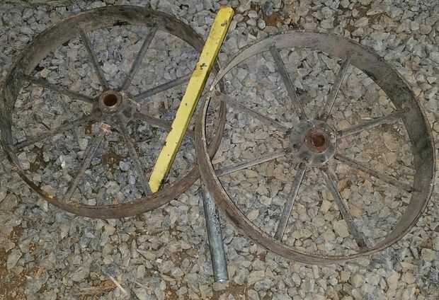 Este es el material que utilicé para hacer la tabla. Dos ruedas de carro cuadrada, tubo, un trozo de tubo, dos arandelas, un perno y una hoja de plexiglás. Tanto las ruedas fueron dobladas, uno más que el otro.