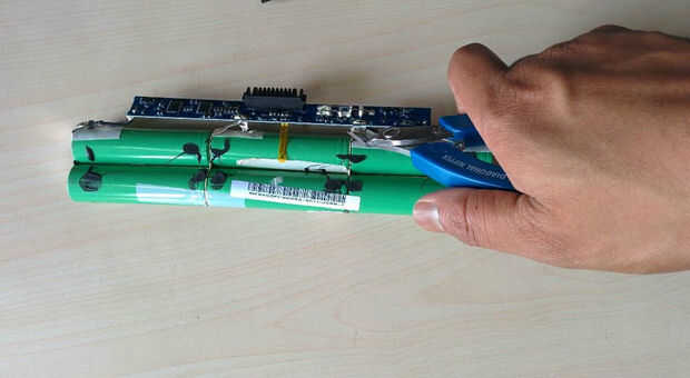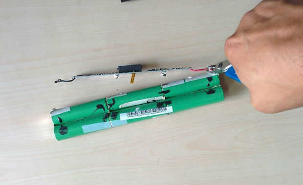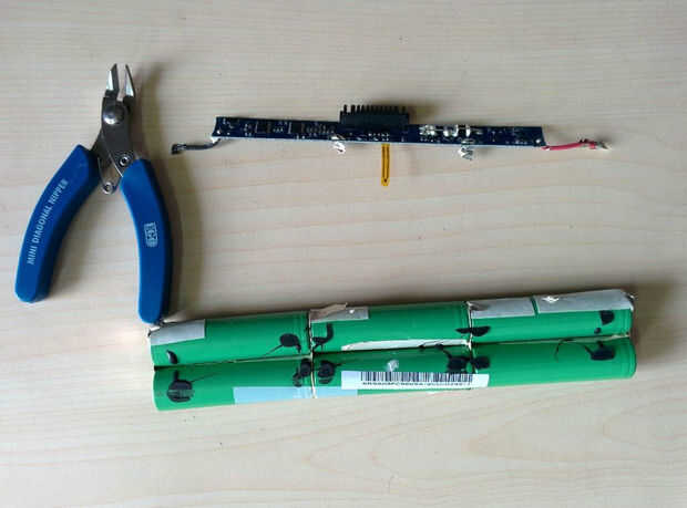 Luego corte con cuidado las lengüetas / cables que están conectados al circuito de carga y entre las células usando un Cutter.After de alambre separa la Junta presidió la guardé para futuros retoques.