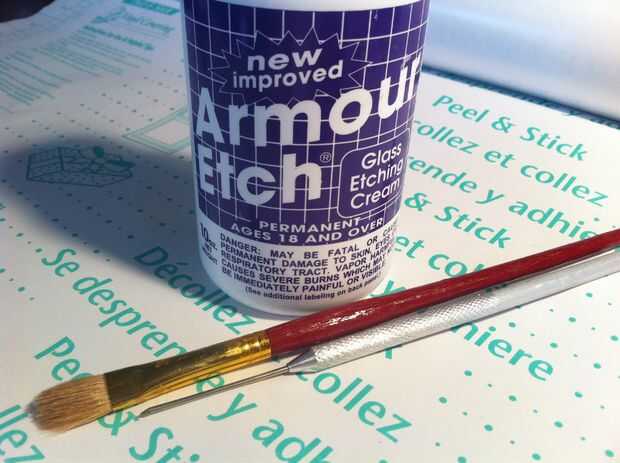 - Crema Armour Etch vidrio grabado (10 onzas cuesta aproximadamente $20,00 en nuestra zona). Asegúrese de comprobar su periódico local o explorar internet para 40-50% de descuento cupones en ocasiones para ahorrar dinero. Cantidades más pequeñas están disponibles, prefiero la botella más grande como Grabe un poco.