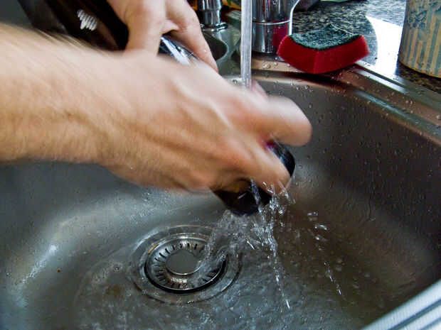 Tip: Cero hasta la esquina de la etiqueta - si está seco - el pegamento se desprenderá con agua, si es pegajosa - el pegamento será acetona/alcohol soluble. Mina estaba seco por lo que aceleró el proceso raspando la parte principal de la etiqueta, entonces fui y había lavada el resto utilizando un exfoliante y un detergente líquido.