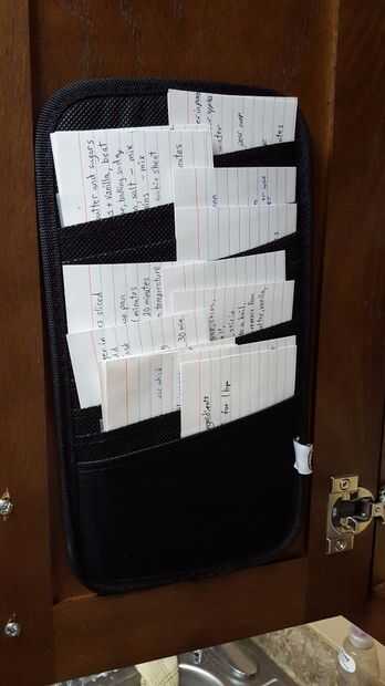 Usar las tarjetas de índice de mis recetas. Estos encajan muy bien en las ranuras de la CD. No tiene muchas recetas sin embargo, esto no es una mejora enorme, pero es todavía mejor que riffling por todas las recetas. En el futuro probablemente será añadir algunos colores a las fichas de índice para organizar mis recetas en categorías. También pensé que sería una buena idea para organizar correo u otros papeles pequeños como recibos. Este proyecto tomó menos de 5 minutos, así que piénselo dos veces antes de tirar a esa vieja organizador CD del visera.