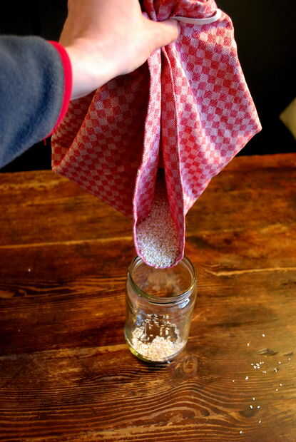 Tomar las esquinas de la toalla de té y levante hasta el contenedor.