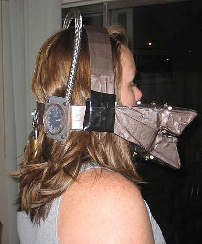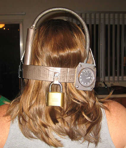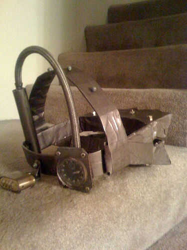 Una vez que la máscara básica de hecho, puede comenzar a añadir extras. Tengo algunas tuercas y pernos y realmente perforar algunos agujeros en el frente de la máscara. Definitivamente esto hizo que parezca más realista. También encontré un trozo de tubería en Home Depot, por lo que agregué en la parte superior de la máscara (ver foto). Y un verdadero candado en la parte posterior. Esto ayudó a Agachen la máscara en la parte inferior y aún por sobre mi cabeza. El contador de tiempo fue una impresión de una imagen que encontré en la web y la parte inferior de un vaso de plástico! He pegado una tira de cartulina delgada alrededor de él y pegado a un tablero con algunas chinchetas de pintada con spray.