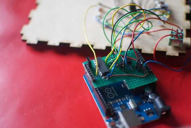 Eléctricamente, los LEDs están dispuestos en una matriz de 8 x 2, formado por dos transistores, juntados a salidas de Arduino y un registro de desplazamiento 74HCT595.