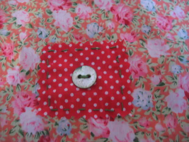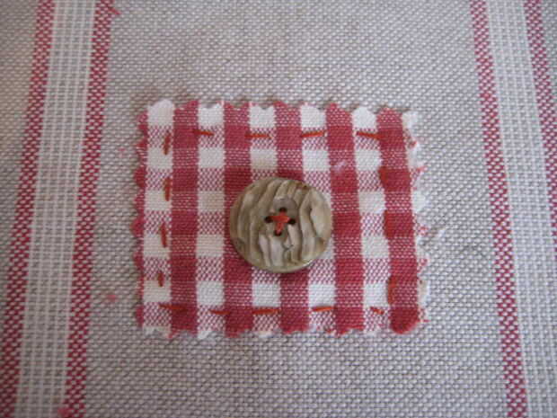 Cortar un cuadrado de 5 cm para cada lado en una tela de contraste. Coser un botón en el centro de la Plaza y luego mano coser el cuadrado en un hilo de bordar en la pieza de tela. Repita para otra pieza.  No olvide colocar la pequeña plaza a un extremo de la tela.