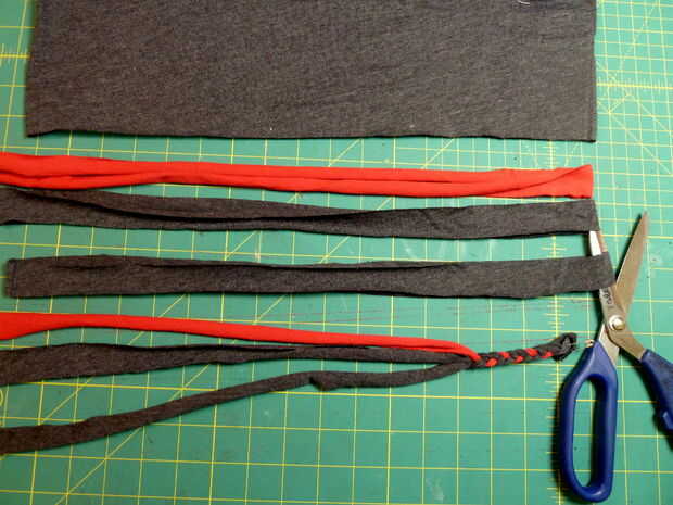 Cose los extremos juntos que terminaras con uno rojo y dos tiras igualmente muy largas gris por correa.