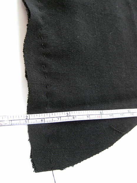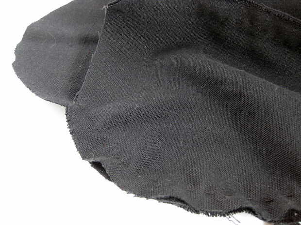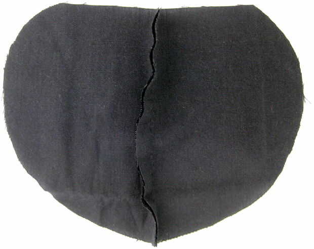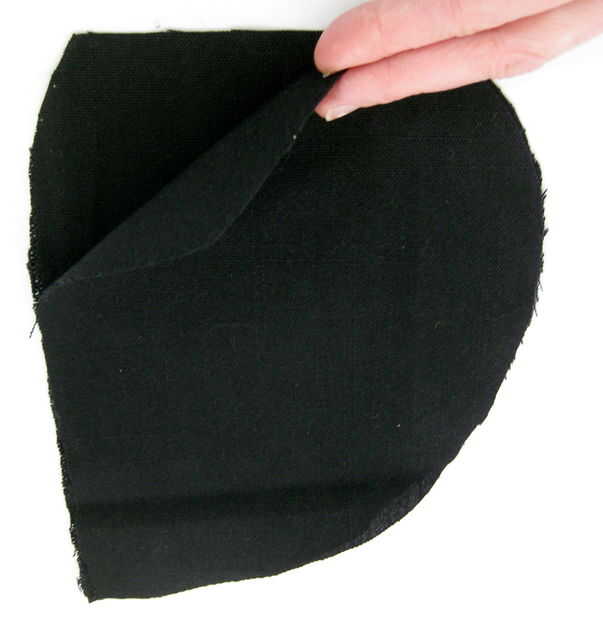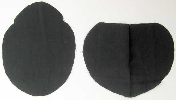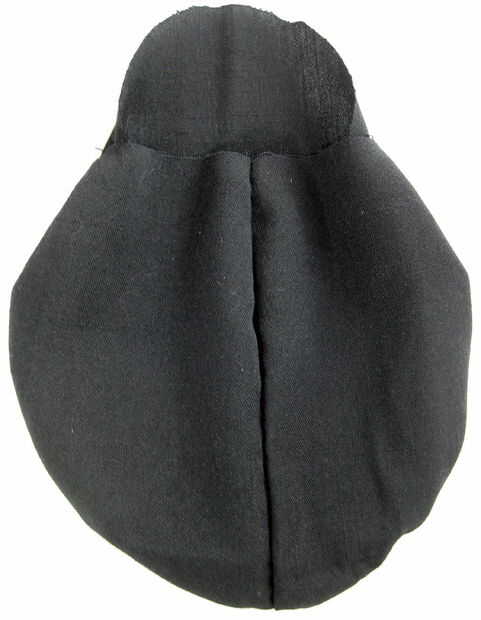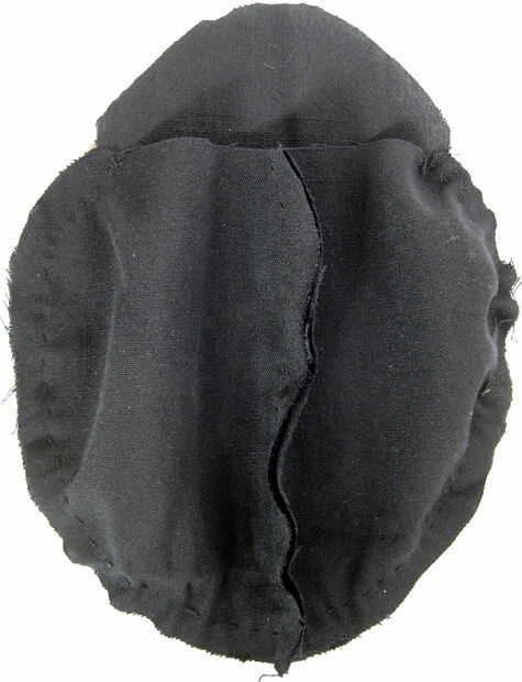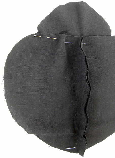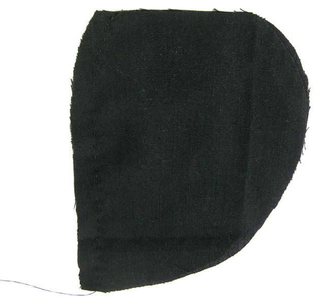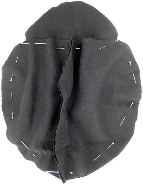 Luego tomar la pieza de base adulto y (usando el hilo negro) cosen los bordes redondos en los bordes alrededor de las piezas superiores adultos (vea las fotos). Para ello, utilicé alfileres de costura para alinear los bordes y mantenerlos en su lugar. Asegúrese de que todas las costuras en el exterior (que a ser los bancos se adentro hacia fuera). Otra vez, hacer la costura de aproximadamente 1 cm del borde. Coser en el borde corto y recto no, dejarlo abierto por ahora. (Esto es donde la cabeza se unirá más tarde). Cuando haya terminado, darle la vuelta adentro hacia fuera. En este punto se ve como una bolsa negra, en forma de pera.