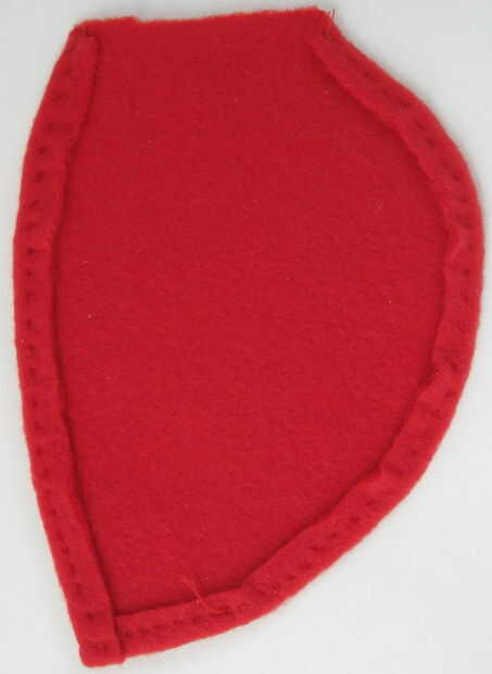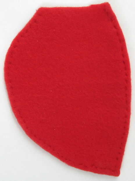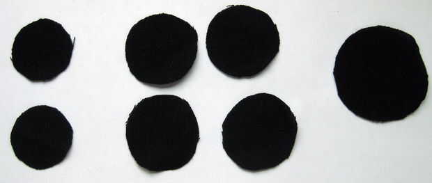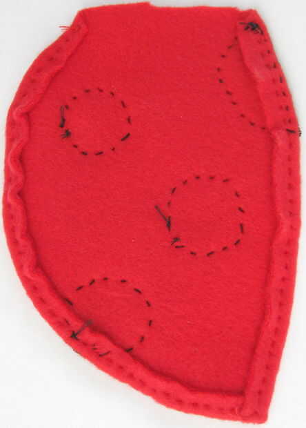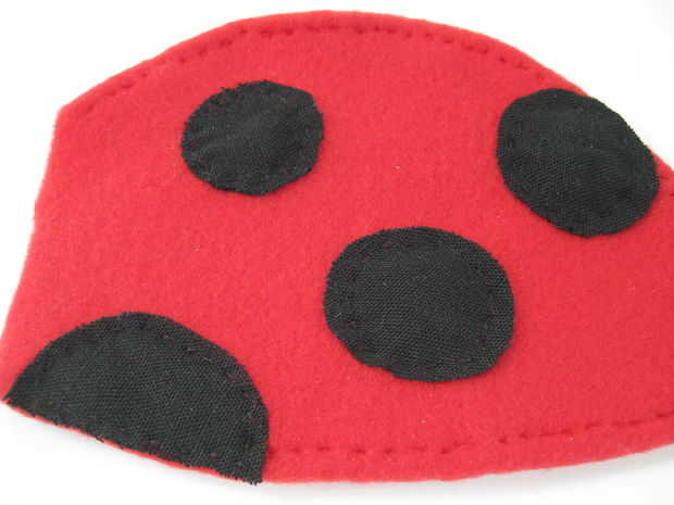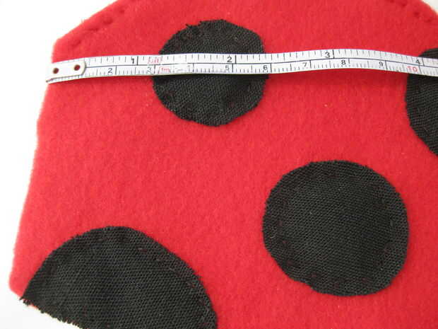 Ahora toma las piezas de punto negro. Corte el punto grande exactamente por la mitad. Arreglar las manchas en las alas lo que quieras ser. Colocar los puntos en la misma posición en cada ala, para que las alas son simétricas. Coser las manchas en las alas (con hilo negro) cuando estés feliz con sus ubicaciones. Mi arreglo se basa en mirar varias fotos de Mariquita. Aquí es donde puse mis puntos en cada ala (ver también las fotos), las medidas son desde el centro de cada punto: