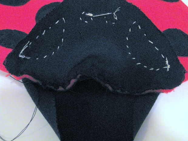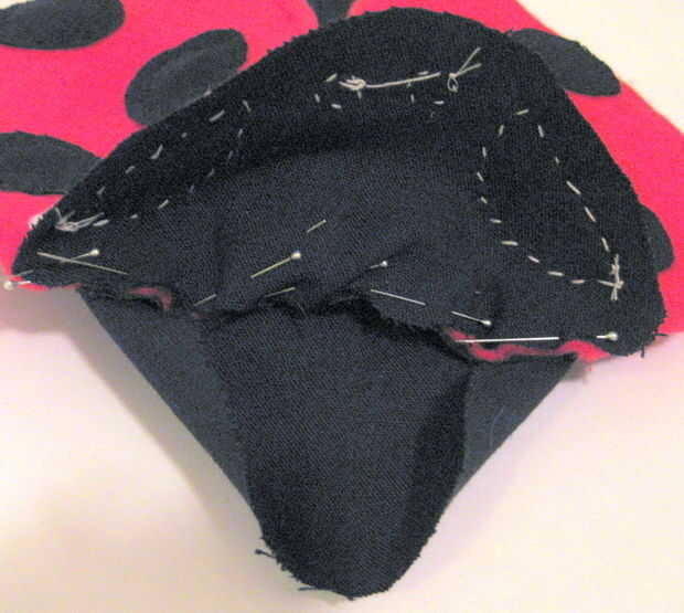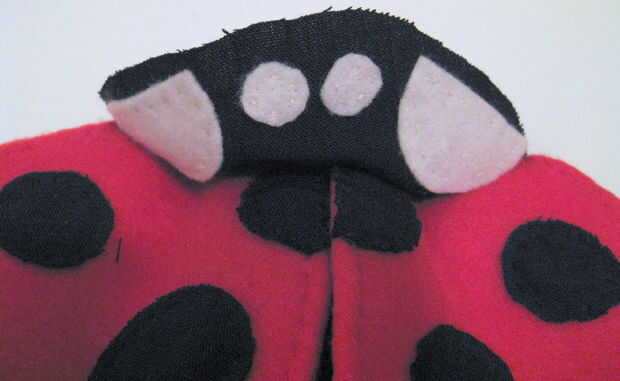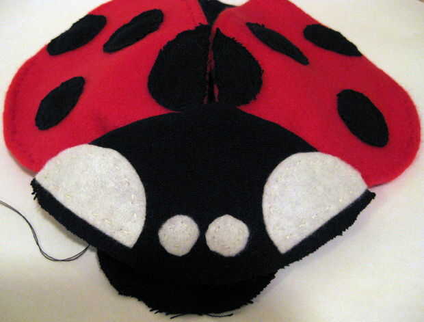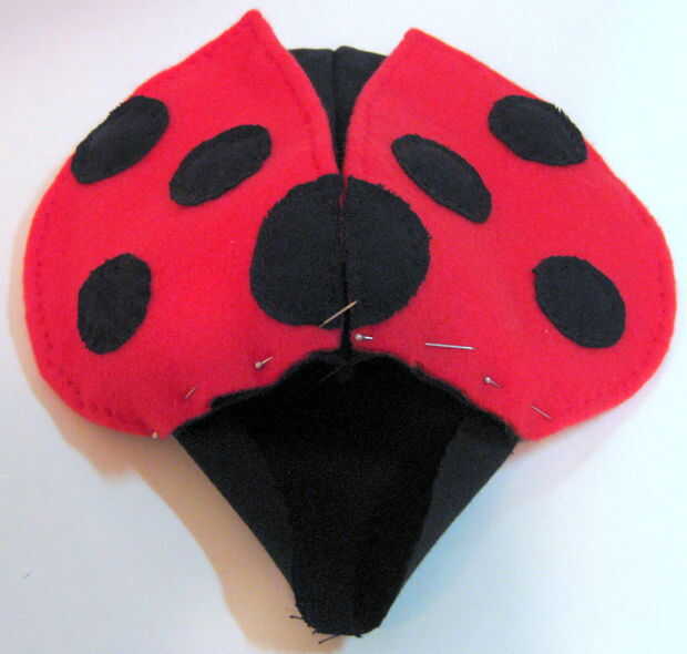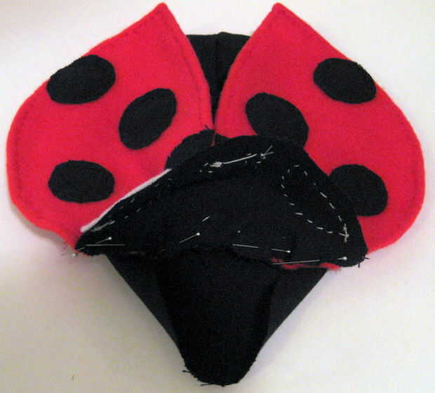 Ahora vas a colocar las alas y la cabeza con el resto del cuerpo de la mariquita. Alinee el borde sin doblar de las alas con la parte abierta del cuerpo de Mariquita negro-ver fotos de cómo hacerlo. Use alfileres de costura para unir las piezas en su lugar. En la parte superior las alas Ate el pedazo de cabeza que acaba de hacer. Otra vez juntos se alinean los bordes cortos y rectos y pin en su lugar. Doblar el borde de la cabeza debajo de sí mismo para que la costura se termina en el interior del cuerpo (y no expuestos en la parte exterior de la misma). Una vez todas las tres piezas, coser ellos juntos (borde en este corto, recto) con hilo negro.