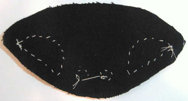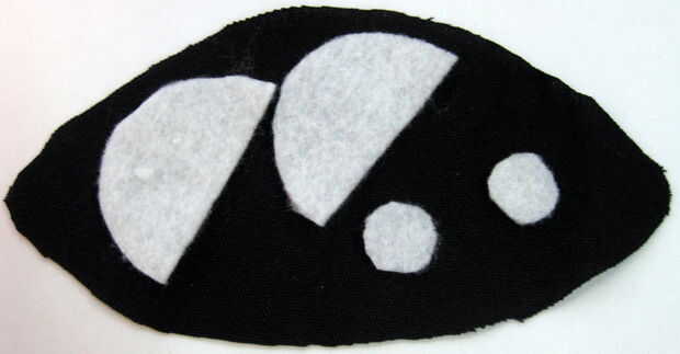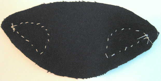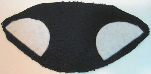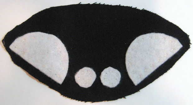 Tener los ojos pequeños y arreglarlos para que estén igualmente espaciados/centrado en el entre el pronoto piezas y espaciado 1 cm detrás del borde redondo del cabezal. Cuando estés contento con la colocación, coser los ojos a la cabeza (con hilo blanco). Una vez más, ver las fotos.