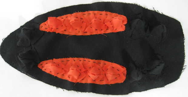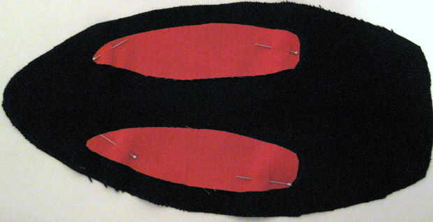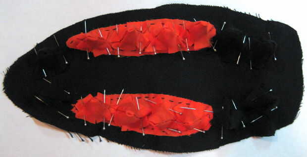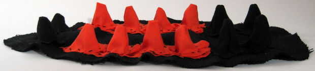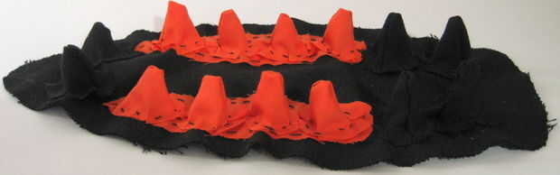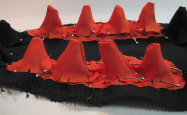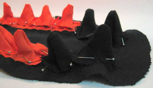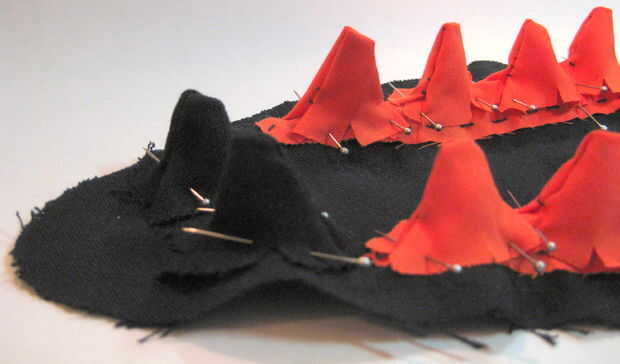 Ahora coge todos los cuernos de la larva que acaba de crear. Organizar por separado los cuernos negro y naranja de mayor a menor (si hay mucha variación de tamaño). Luego coloque los cuernos en la parte superior de la larva que acaba de agregar las piezas de la tira de larva naranja a. Organizar una fila de cuatro cuernos naranja en cada franja naranja, pasando aproximadamente de mayor a menor (los más grandes hay que acercarse más a la cabeza, que es el borde corto, plano). Luego, delante de cada tira de naranja, coloque dos cuernos negros (otra vez, yendo de mayor a menor medida de la cabeza). Detrás de cada tira de naranja, coloque un cuerno negro (los dos más pequeños). Use alfileres de costura para mantener todo en su lugar. Doblar hacia fuera las partes inferiores de los cuernos porque usted se cose en el cuerpo usando las aletas (por esta razón usted cortar las ranuras de 1 cm). Una vez que estés feliz con la colocación, coser todo el cuerpo con hilo negro.
