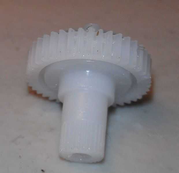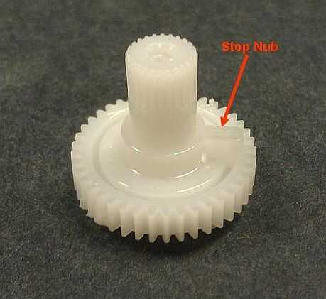 • Corte el quid de la parada de la marcha, teniendo cuidado de no dañar los dientes del engranaje. La esencia debe ser retirada completamente hasta la superficie del engranaje. Usé un cuchillo Exacto para limpiar las superficies después de pellizcar la mayoría de la esencia con cortadores laterales. Archivo de una joyería también debería funcionar bien para la limpieza de las superficies.