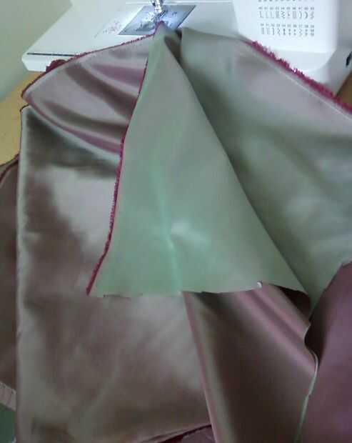 Volcó a la tela para que la mitad de mi cartera es de color rosa y la otra es verde. Coser juntos. Esto crea el 'centro' de la bolsa! (Hacerlo con cada conjunto de piezas)