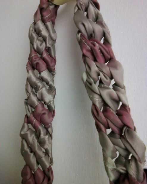 Una vez que todas las tiras son cosidas con bordes limpios... puede la trenza o la tela del nudo. Elegí hacer nudos. Hacer esto hasta que quedan sólo una pequeña cantidad. Meta el extremo de los mangos entre la cáscara y el forro del monedero en las costuras laterales. Prender y cosa todo alrededor de la parte superior.