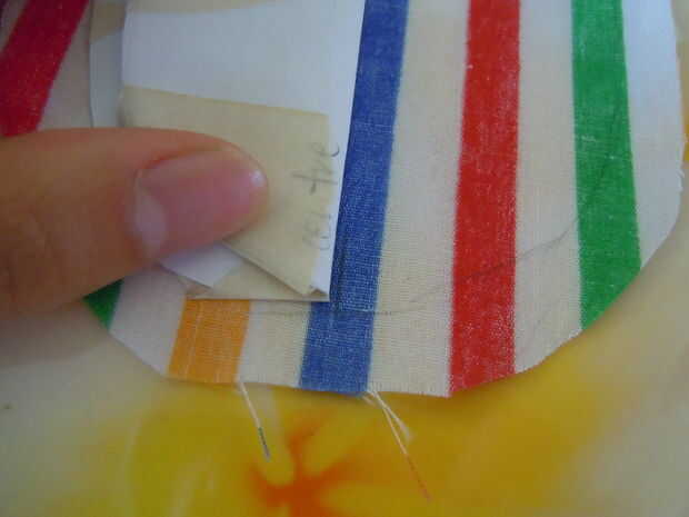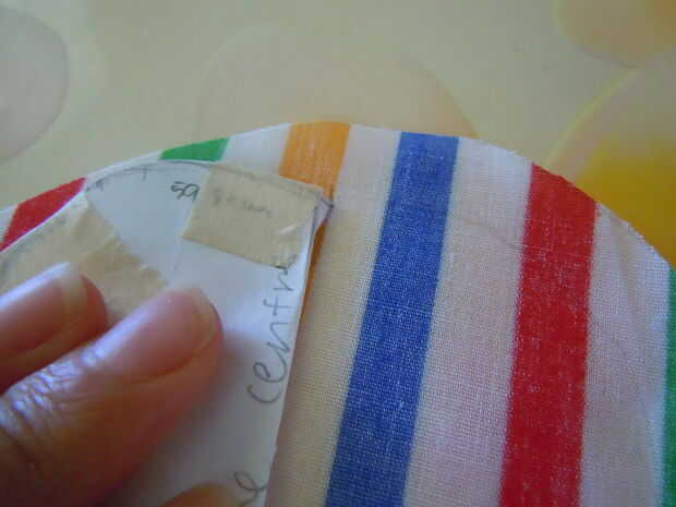 Utilizando el patrón de base como guía, marque los centros de las piezas base. Ahora, juntando los lados derecho, prender y coser juntos los pedazos del patrón como lo hizo con la cinta adhesiva. No olvide alinear los centros!