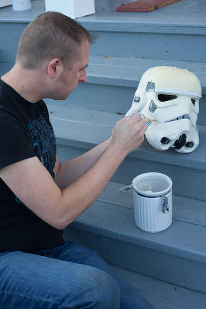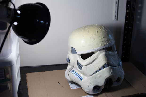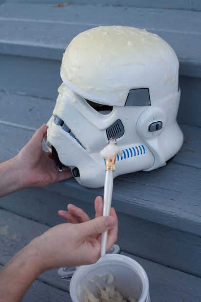 Apliqué el Retr0bright con un pincel, asegurándose de obtener una capa bastante uniforme sobre toda la superficie. No debe afectar ninguna pintura o las calcomanías de vinilo, así que pinté derecho sobre ellos. Entonces coloqué el casco bajo mi luz UV. También puede hacer esto fuera en un día soleado. Sin embargo, desea Asegúrese de que su casco no te caliente demasiado al sol o puede dañar el plástico. Decidí lo jugar a seguro y utilizar un reptil luz, me dio la posibilidad de dejar mi casco desatendida sin preocuparse por algo que (como el perro de pensamiento parece divertido jugar con).