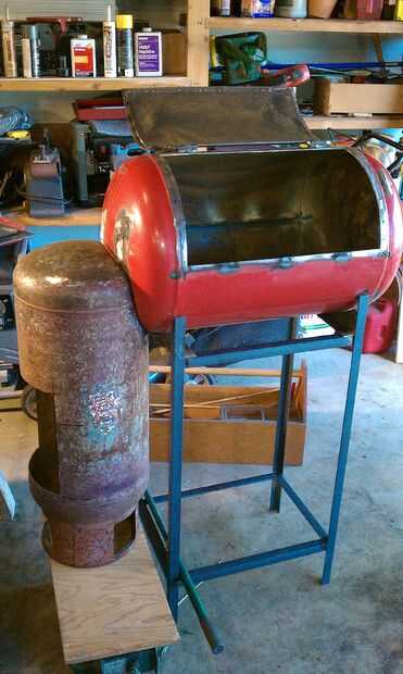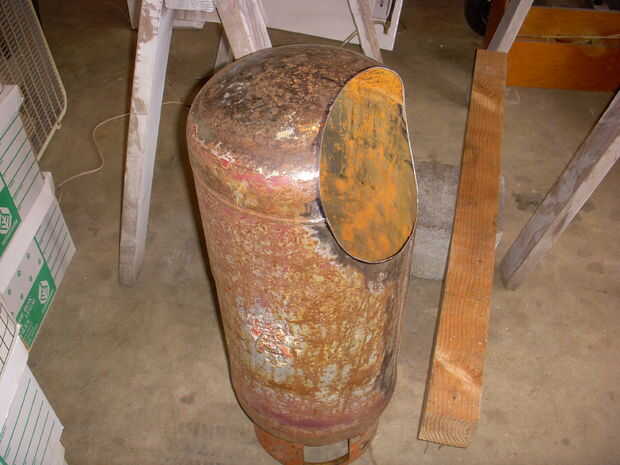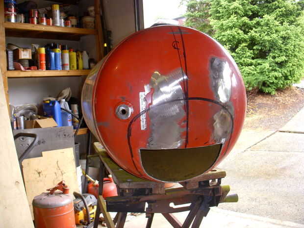 Me olvide de tomar algunas fotos de cómo tengo las curvas de los dos tanques para que coincida con. He comprado tubo de cartón para zapatas de hormigón del mismo tamaño que el tanque de gas LP. Corté el tubo para que coincida con el tanque de humo y cuando lo conseguí a cortar el tubo por la mitad y grabado en el tanque de gas LP para trazar el patrón. Después de que usted corte el patrón encajan los dos tanques, a medida para la abertura para el humo viajar.