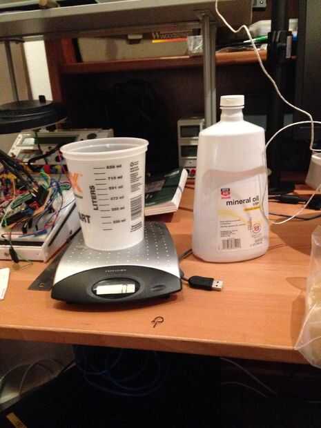 Medir a tres partes en peso de aceite mineral usando la balanza digital. (para mí esto era 24 onzas)