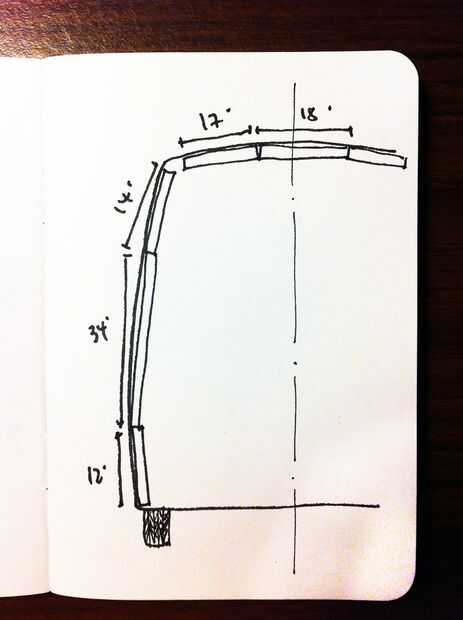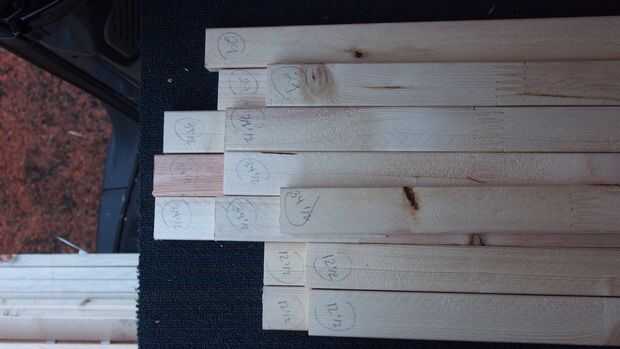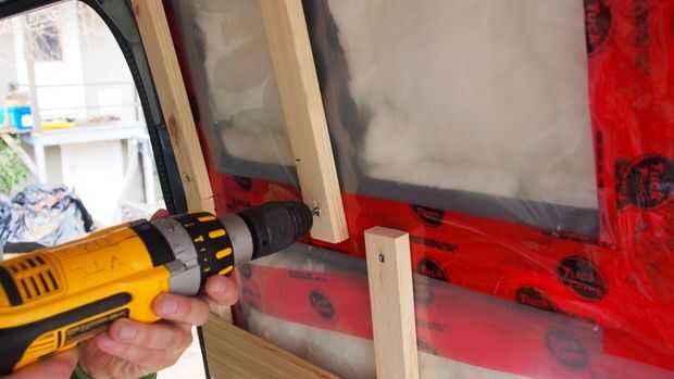 La furgoneta tiene una curva natural y forma cónica hacia el techo. Esto significó que no podríamos utilizar un montante para ir directamente de piso a techo. Mirando la estructura de la furgoneta, decidimos que lo más fácil sería separarlo en tres secciones, en donde están los montantes de metal base. Medimos las tres secciones y había cortada herretes en consecuencia (a 12 pulgadas para la parte inferior, 34 para el centro y 14 para la parte superior). Nuestro objetivo era ponerlos lo más posible a distancias iguales (aproximadamente 16 pulgadas). Sin embargo, algunos detalles en la camioneta nos obligó a cambiar algunos postes de madera alrededor de una broca.