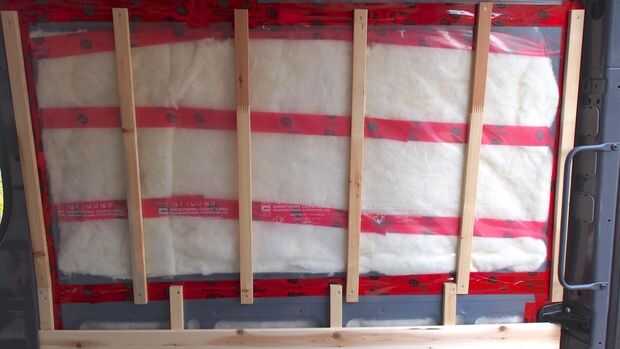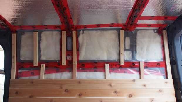 No queremos poner todos los paneles directamente a las paredes de metal en la furgoneta porque hubiera sido muy difícil y frágil, por lo que instalamos postes verticales (1 x 2 pulgadas) en la que luego podremos clavar los paneles de cedro.