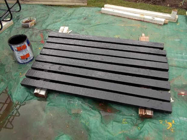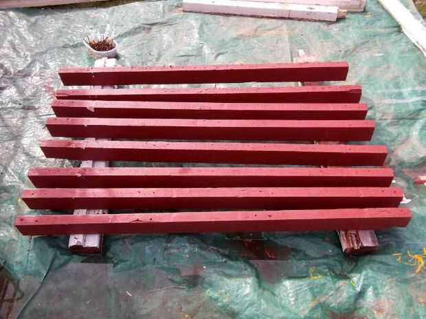 Luego salió mi barra de desmantelamiento de la plataforma y despojado de un puñado de 2 paletas de manera a obtener el muy útil 4 "X 2" maderas de larguero. Que he pintado con el rojo rico-óxido de zinc diluido con disolventes de la celulosa para ayudar a la pintura se hunden en la madera. Al día siguiente, los largueros undercoated recibieron dos manos de pintura negro brillante.