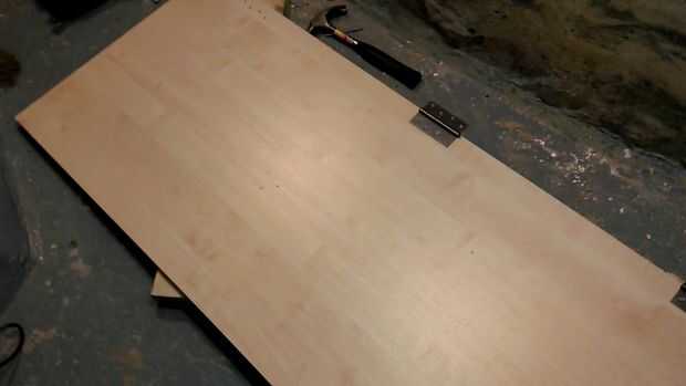Luego, mida y corte un pedazo de madera a la medida para su escritorio. Compré un trozo de aglomerado de 2440x600mm laminado de B & Q y tiene que cortarla a la anchura de mi pared de trabajo plataforma (caps encantadoras que son).
