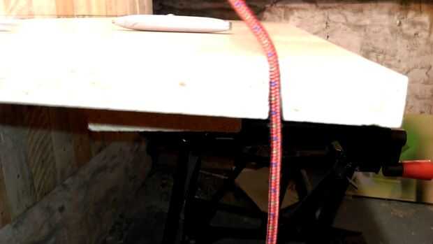 Para soportar su escritorio, usé 2 longitudes de subir la cuerda (bastante fuerte para el peso de una persona!)