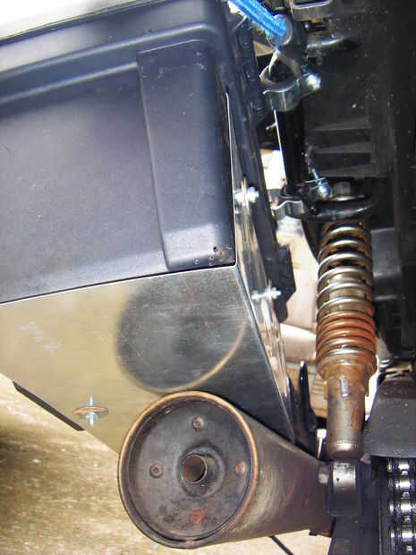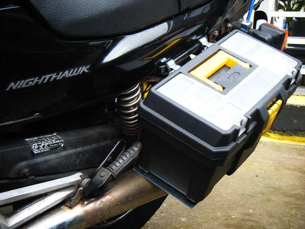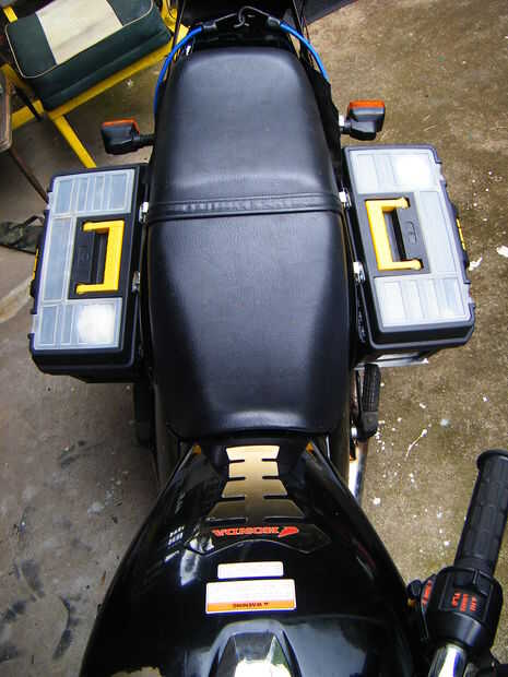 Este nuevo diseño se ajusta mucho más a la estructura de la moto sin comprometer la seguridad. Esto cambia de puesto la mayor parte del peso sobre el silenciador permitiendo menos vibración y rebote. Carenados de Flash ayudan para impedir que la caja de herramientas se derrite bajo el calor del tubo de escape.