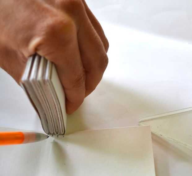 Cortar un rectángulo, suficientemente grande para contener todos los folletos, de un pedazo de cartón delgado o papel más grueso. Encontrar la tapa de un cuaderno o una carpeta de papel funciona bastante bien para esto.