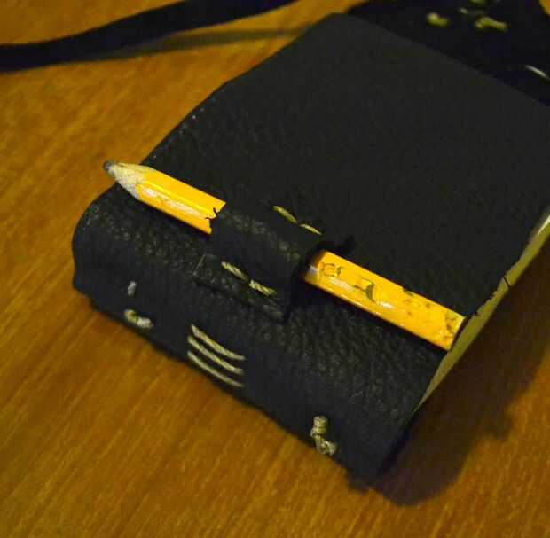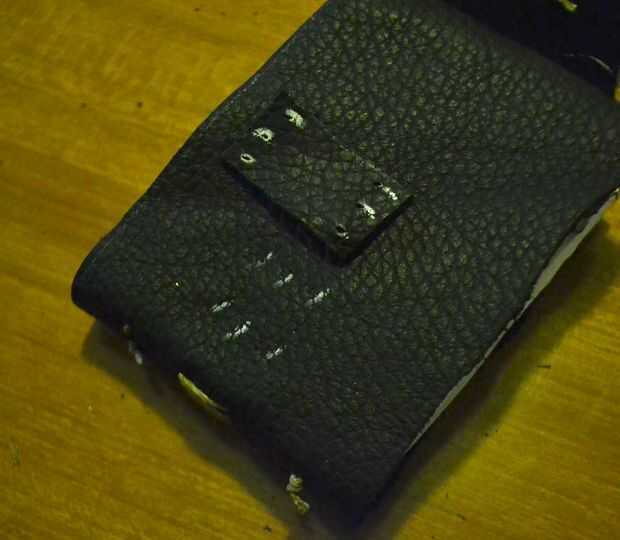 Corte un cuadrado pequeño de cuero, unos agujeros en los lados y coser al lado de la carpeta de cuero.