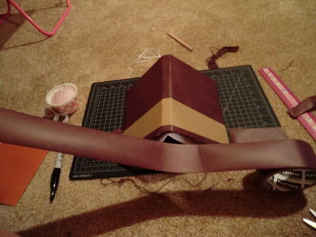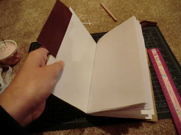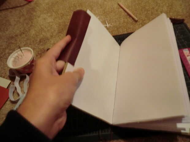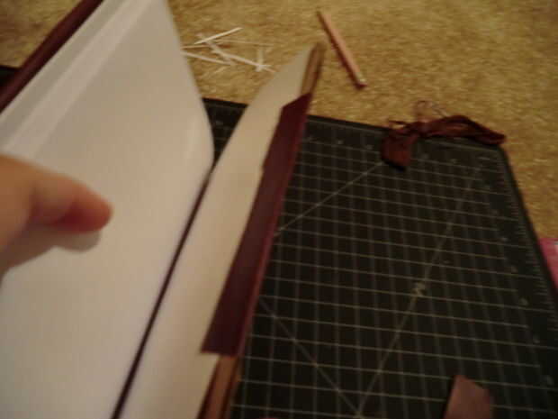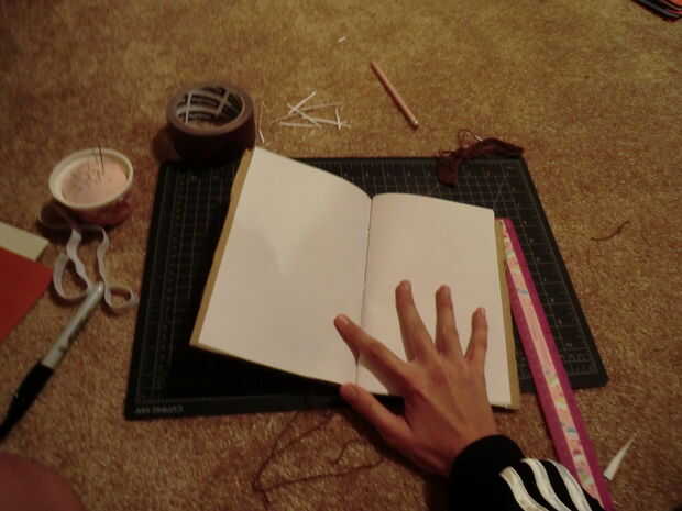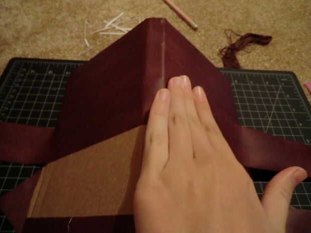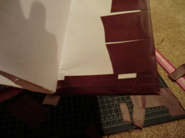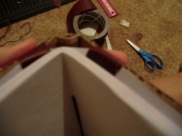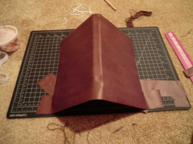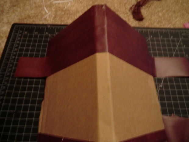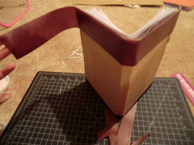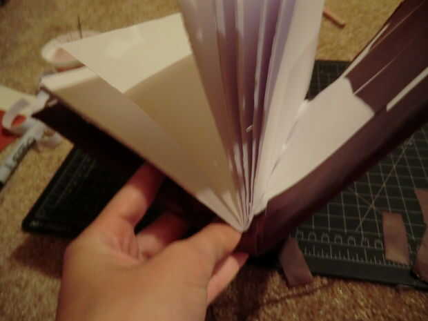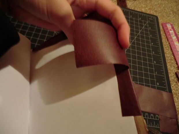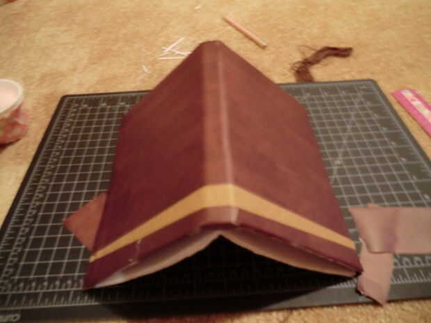 Con el diario doblado un poco, tome la primera y la última página del folleto de papel y con cinta adhesiva a la cartulina cubierta. Puede ser necesario algún ajuste. Luego, su diario boca abajo y rasga trozos de cinta un poco más de la revista. La primera pieza con aproximadamente una pulgada demasiado colgando la parte superior de la cinta. No pegar la parte superior hacia abajo todavía. Continuar grabando, alineando cada tira de cinta adhesiva con la parte inferior de la última. Una vez en la parte inferior de su diario, lo mismo como hiciste la parte superior. Doblar todos los lados de la cinta salvo la parte superior e inferior. Para las piezas superior e inferior, dé vuelta el diario para el lado abierto y cortar la cinta en las esquinas para que ambas piezas se pliegan muy bien. También corte a cada lado de la espina dorsal y pegar la sección de la columna vertebral de la cinta hacia abajo de la última. Ver las fotos para obtener una explicación visual.