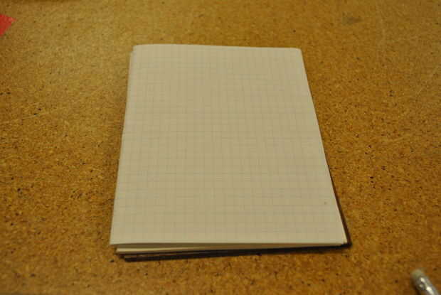 Al marcar los agujeros en las páginas, usé la tapa como guía y marcados los dobleces con un lápiz. Desea que los agujeros marcados en el pliegue. Guardé todas las ocho hojas juntos. Un grupo de hojas se llama una firma. He tenido dos firmas; uno formado por 8 hojas de papel cuadriculado y uno formado por 8 hojas de papel normal.
