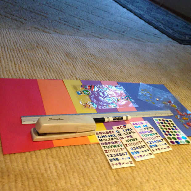 Para empezar, necesitas: 5 hojas de papel de color (rojo, naranja, amarillo, púrpura, rosa, azul), una grapadora, una regla, etiquetas engomadas de la carta y otras pegatinas coloridas y un marcador negro.