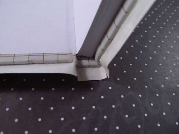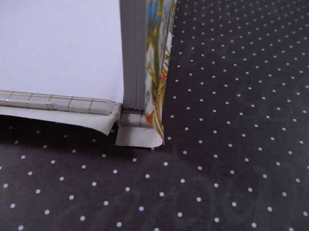 Cuando termine el corte hacia abajo el papel de los bordes para aproximadamente 1,5 cm (más 1/2") y pegar el papel restante alrededor de los bordes de la libreta. Comience con los lados más largo (superior e inferior de la notebook)